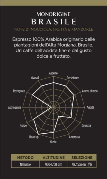 雨の多い夏と乾燥した冬が、高地にあるブラジル最高の栽培所で生産されたこの希少なモギアナアラビカには好適な環境となっており、しっかりしたボディー、ほのかな酸味、フルーティーな香りにアーモンドやナッツの香りが混ざり合い、いつでも気軽に飲める100%アラビカ豆のエスプレッソ