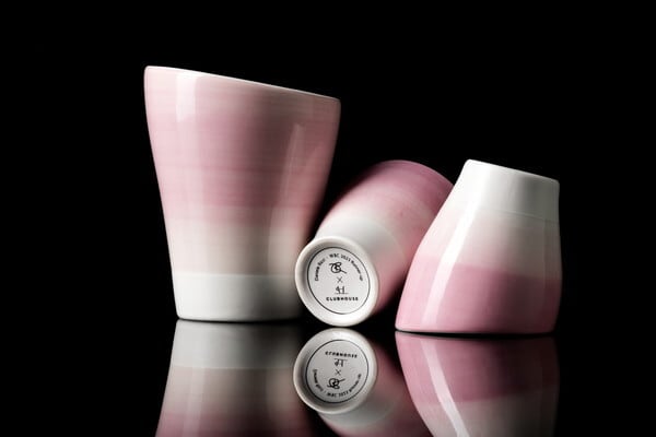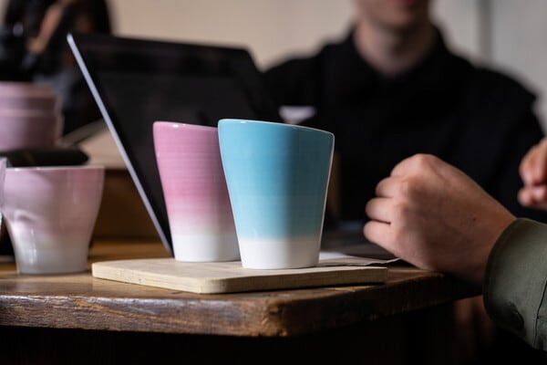 カップ下部のマットな白の仕上げと対照的に、手描きの鮮やかな光沢のある釉薬が特徴です。